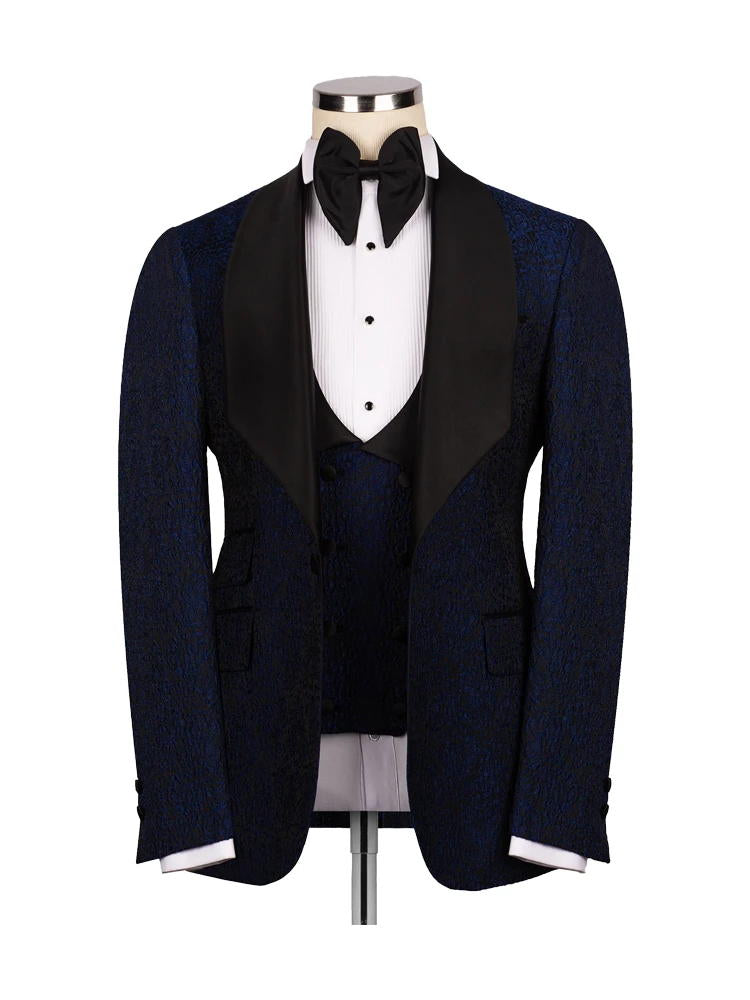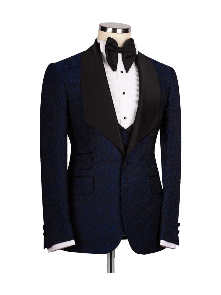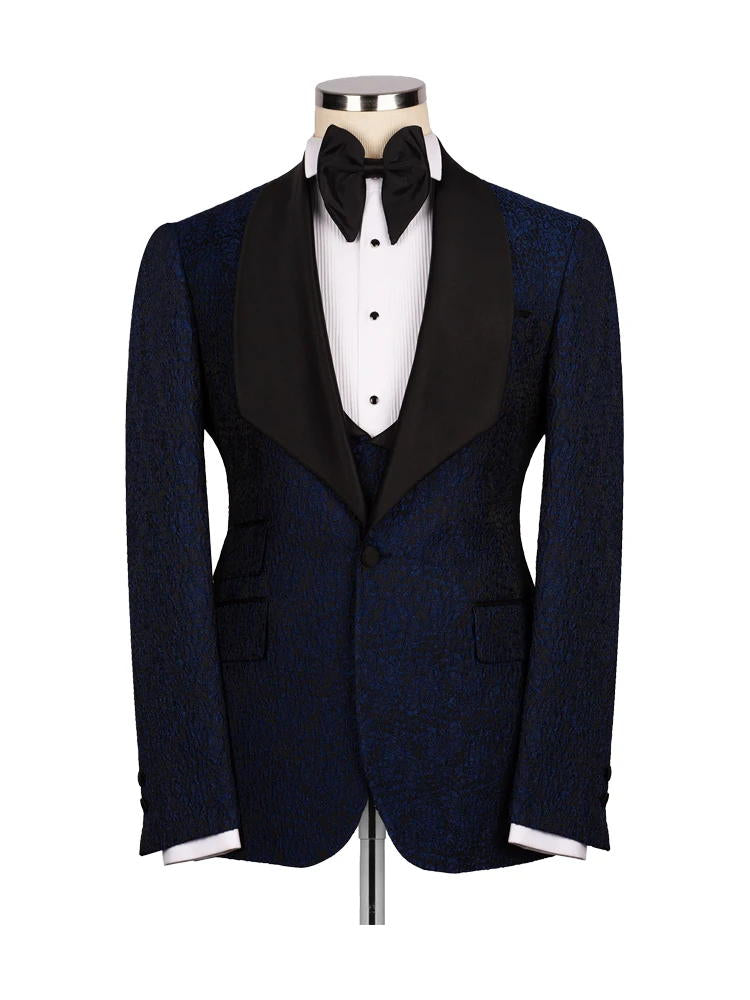 Navy Blue 3 Piece Jacquard Shawl Lapel Wedding Tuxedo